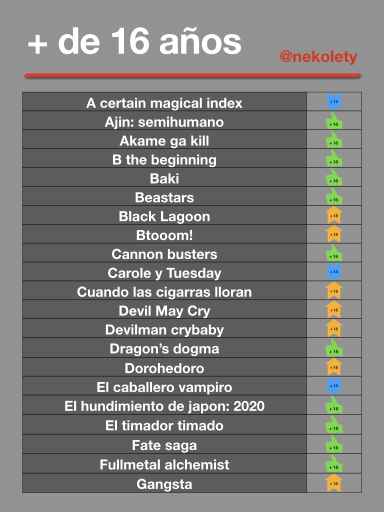 Llegamos a la calificación más controvertida, por la delgada línea que separa las dos edades. En este análisis he querido remarcar aquellos animes de Netflix que no solo por la violencia, sino también por el contenido gráfico no los considero adecuados para ver antes de la mayoría de edad.